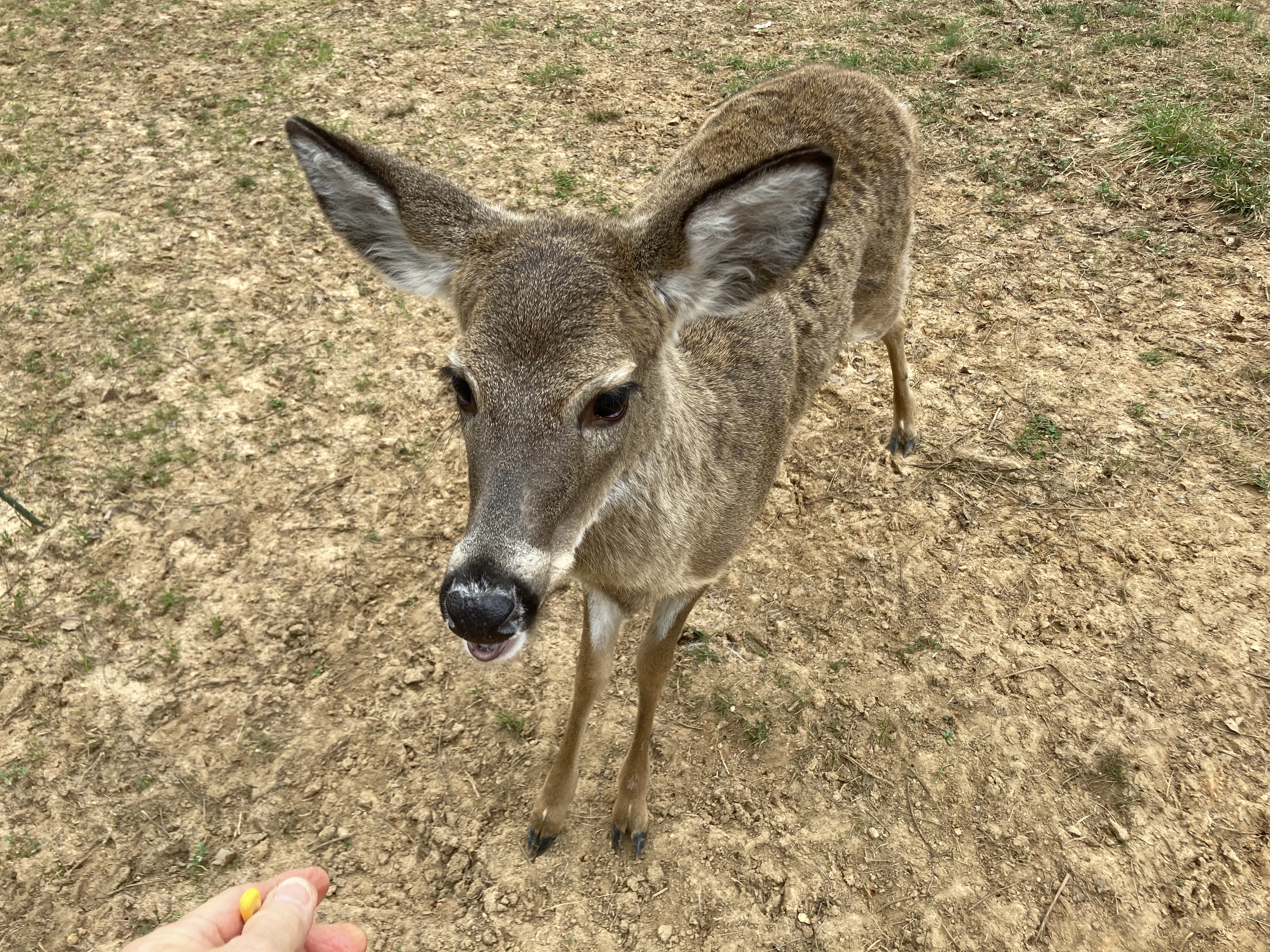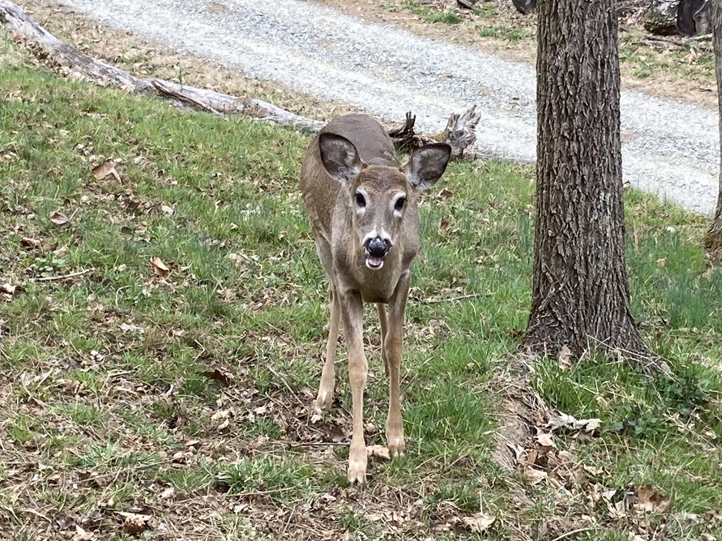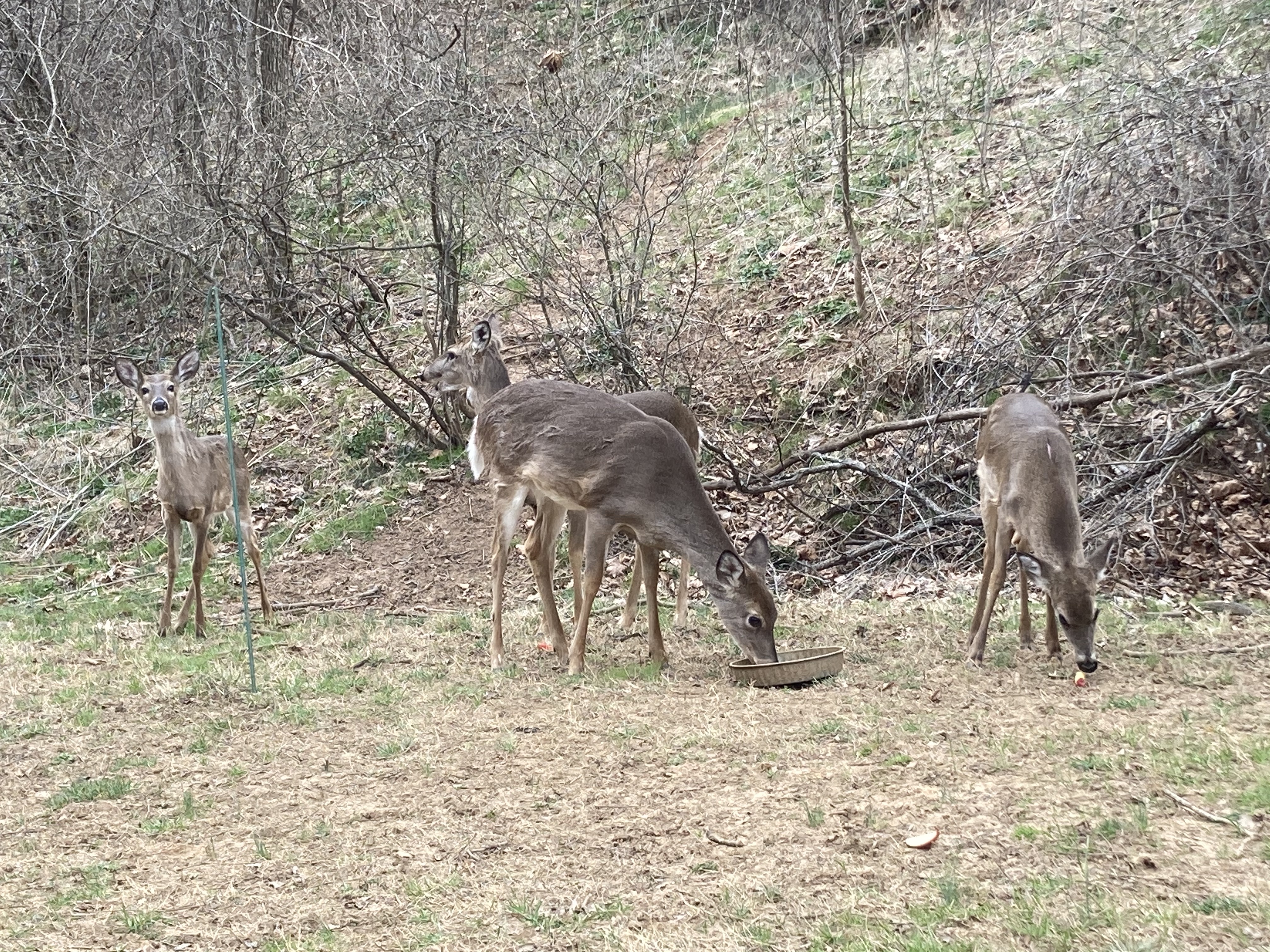 It’s late in the afternoon; I keep checking to see if the deer have arrived and am relieved that they haven’t. We’re still in the midst of a thunderstorm, and it looks as though it may continue for a while. The deer would rather avoid leaving their cover in this weather, too, I think; once in a while they don’t show up in heavy storms. Here are some photos taken in nicer weather. You can see that they are looking skinny and shaggy.