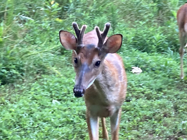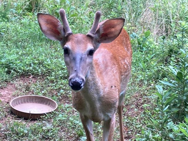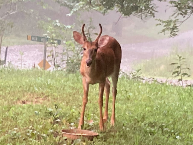 Although there appears to be plenty for the deer to eat (including the phlox and other flowers in my garden!), several are waiting to be fed almost every morning. The young bucks born last year are especially eager, but the mama does often chase them away.